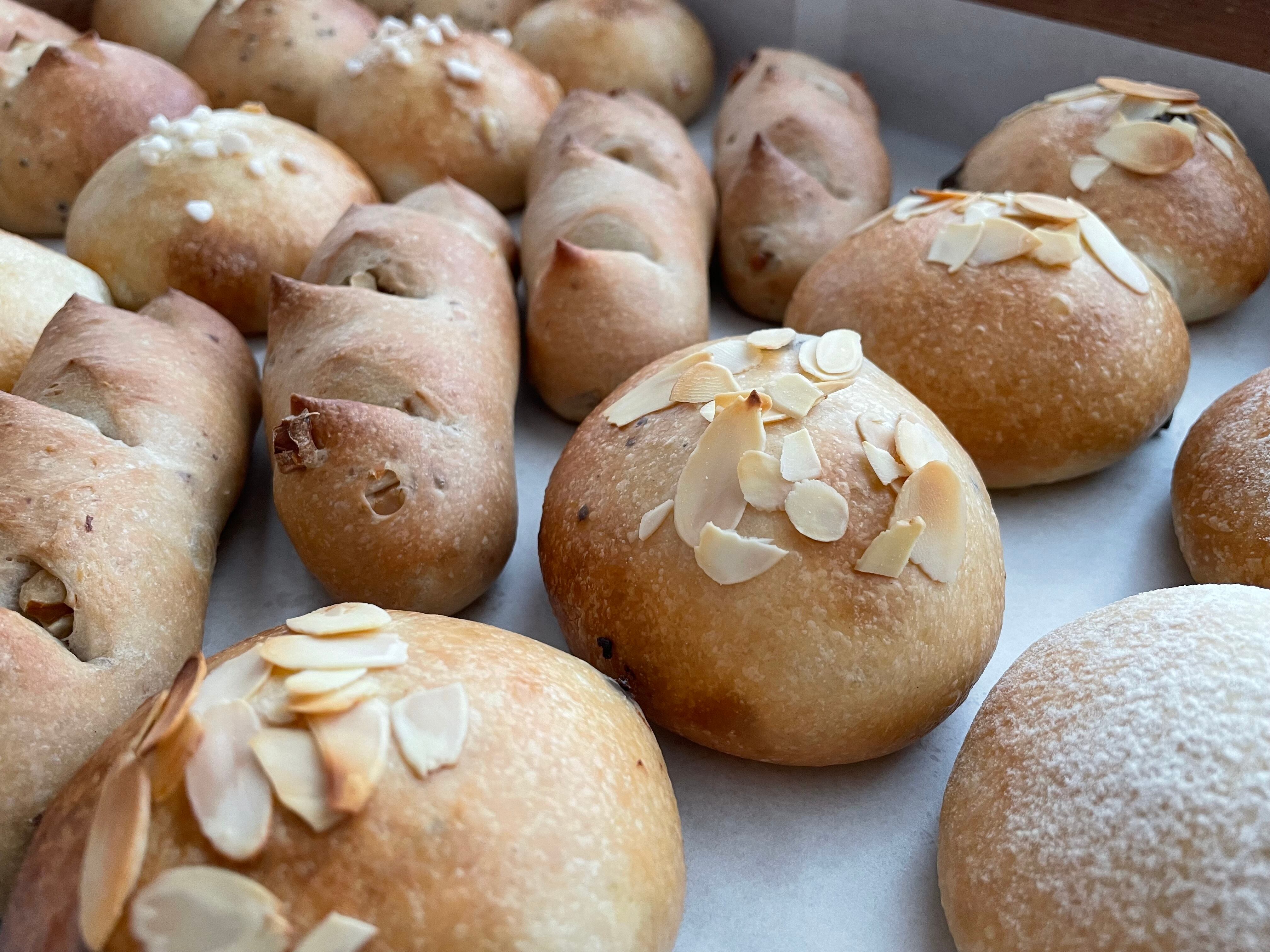 プレーン、エゴマ、オレンジ、クランベリーとホワイトチョコ、くるみ、塩パン各2個、合計12個セットです